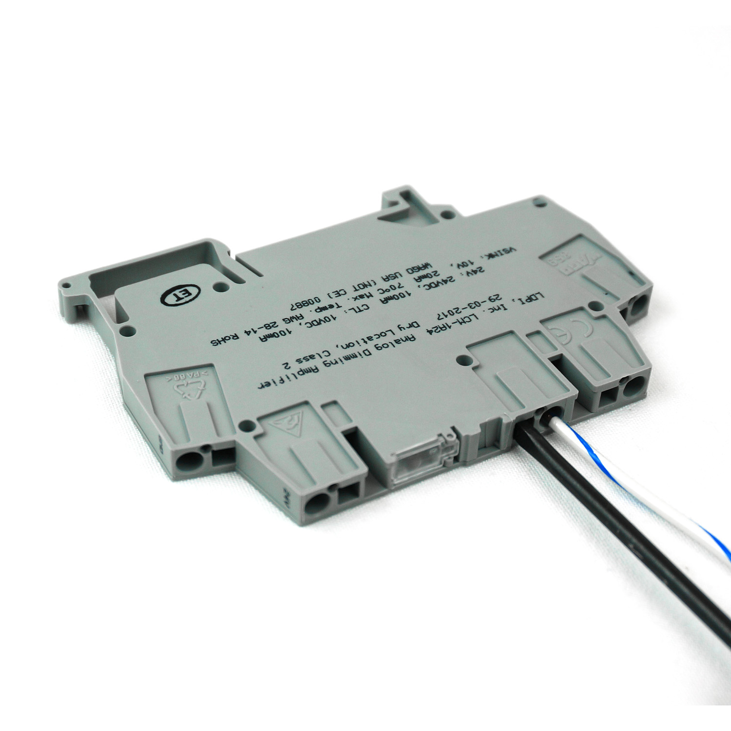 The LCM analog dimming amplifier creates a standardized 0-10V signal for use with LDPI lighting fixtures. This device allows the user to dim LDPI lighting fixtures with their existing industrial PLC using a 0-10V Analog output module. The LCM has a manual toggle switch that can override the PLC program and power lighting fixtures connected to it at 60%.
