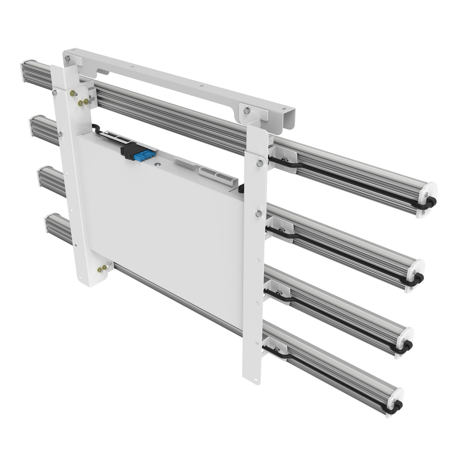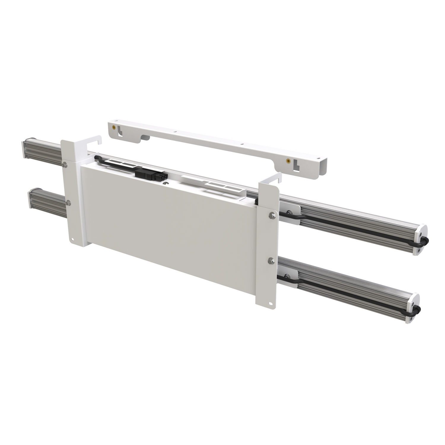 This fixture utilizes an easy mounting system. A “mounting bridge” is provided and is to be attached to the end user’s structure. The fixture is then attached to the mounting bridge using the rigid hooks on the top of the fixture. A locking plate is then attached securing the fixture in place.